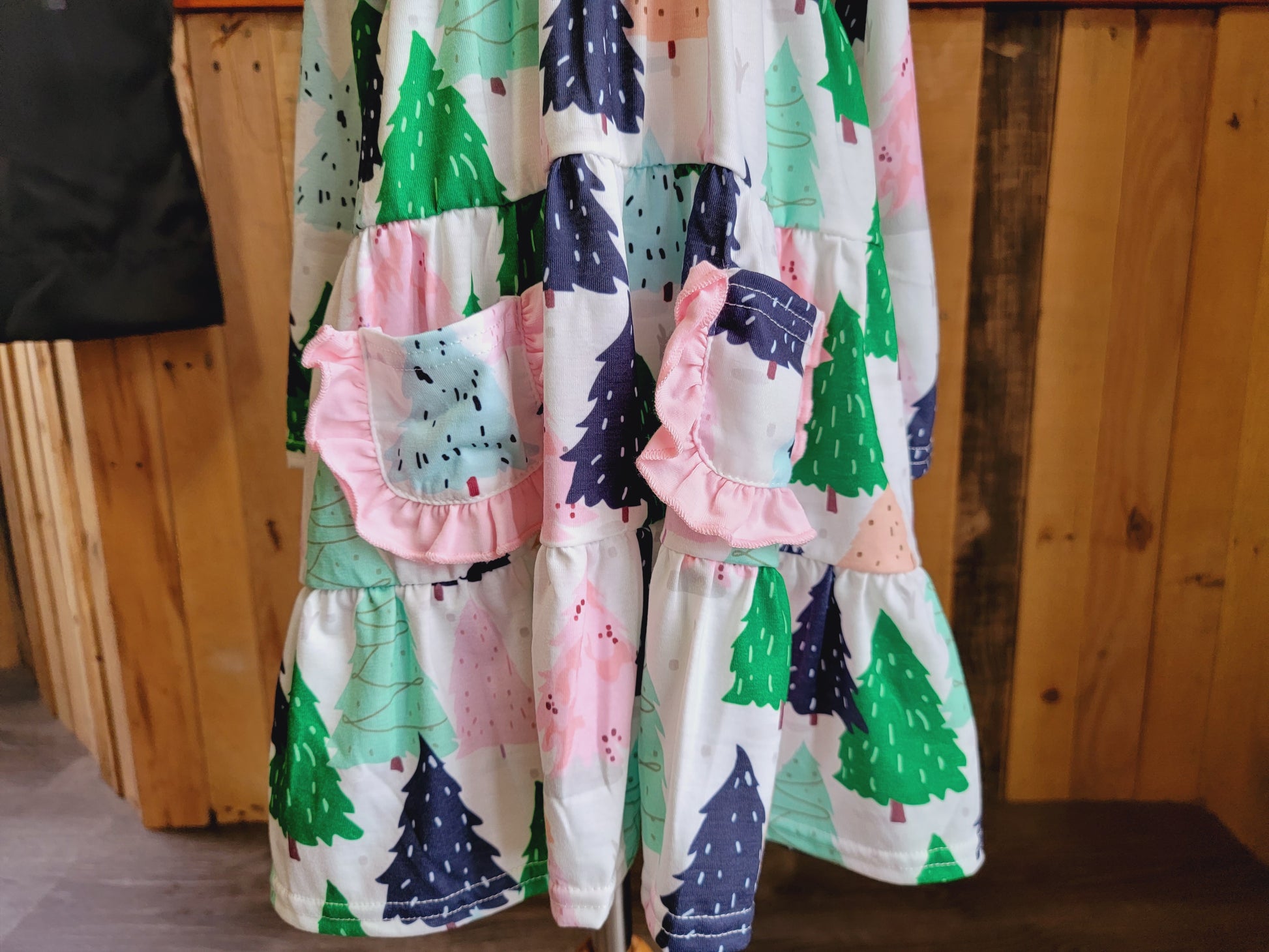 Pastel Christmas tree dress with dual front pockets and bow peek a boo on back.