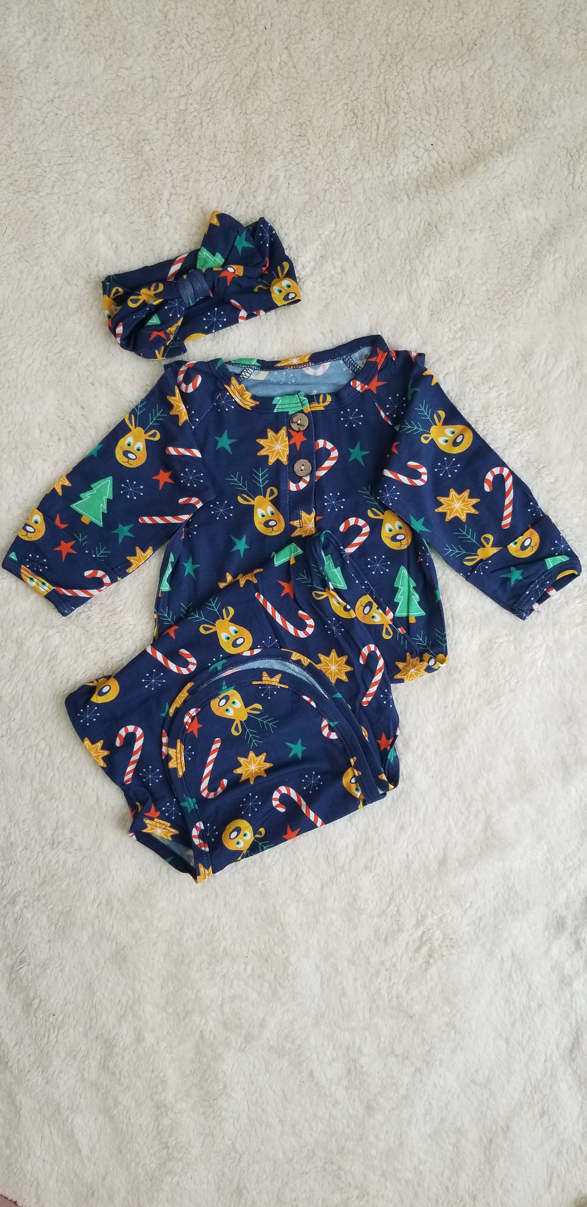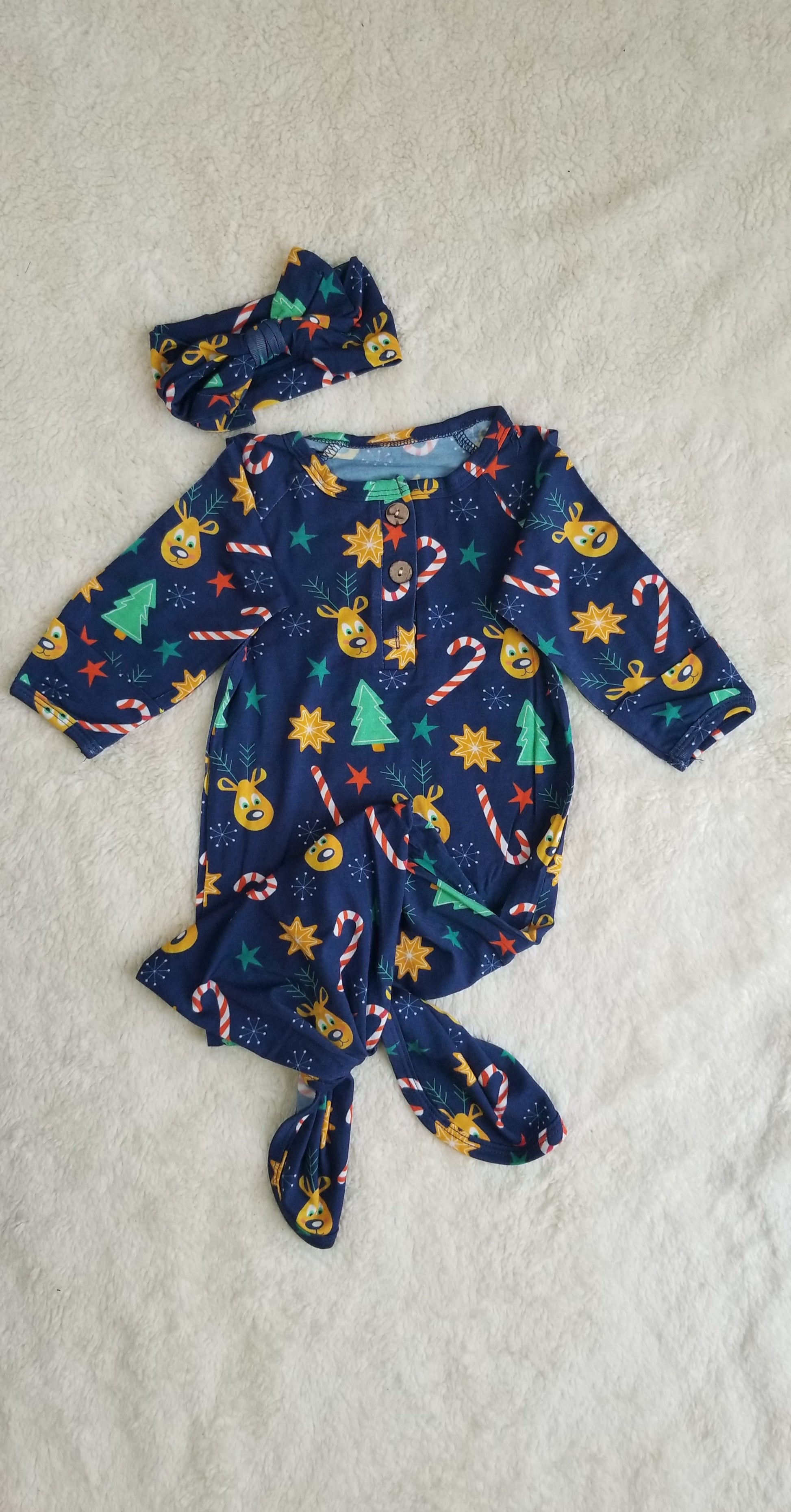 Christmas them printed baby gown. Easy to tie and fits babies up to 24 inches, with lots of room to stretch. Comes with adjustable and stretchy headband.