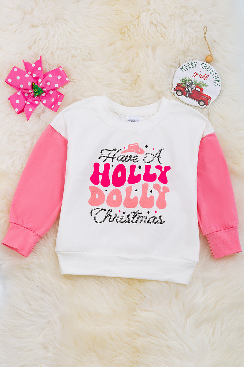 This Have a Holly Dolly Christmas" Girls graphic sweatshirt is the perfect addition to your little one's winter wardrobe. It is made of 97% cotton and 3% spandex for maximum comfort and durability. The colorful design will brighten up any winter day!