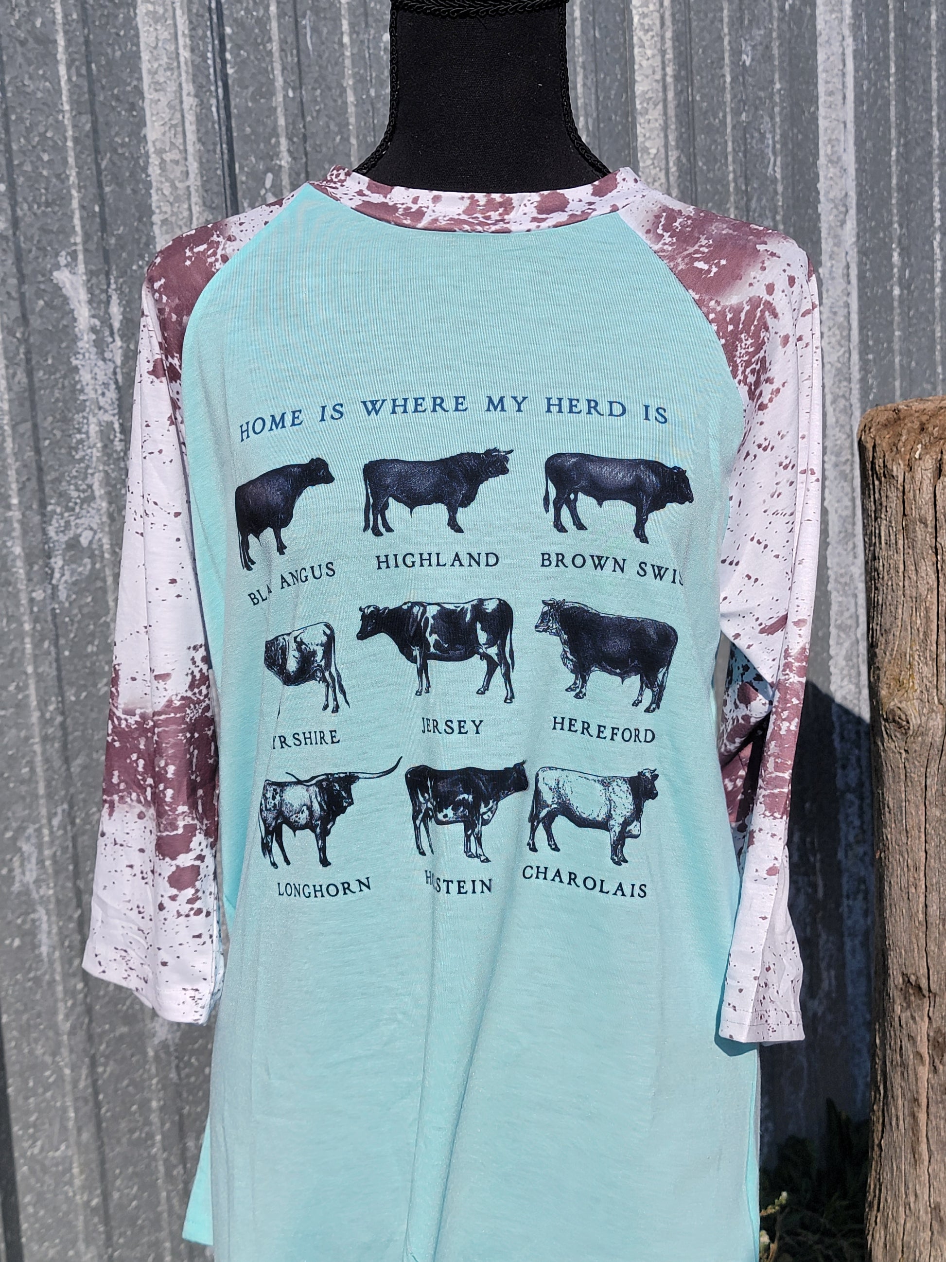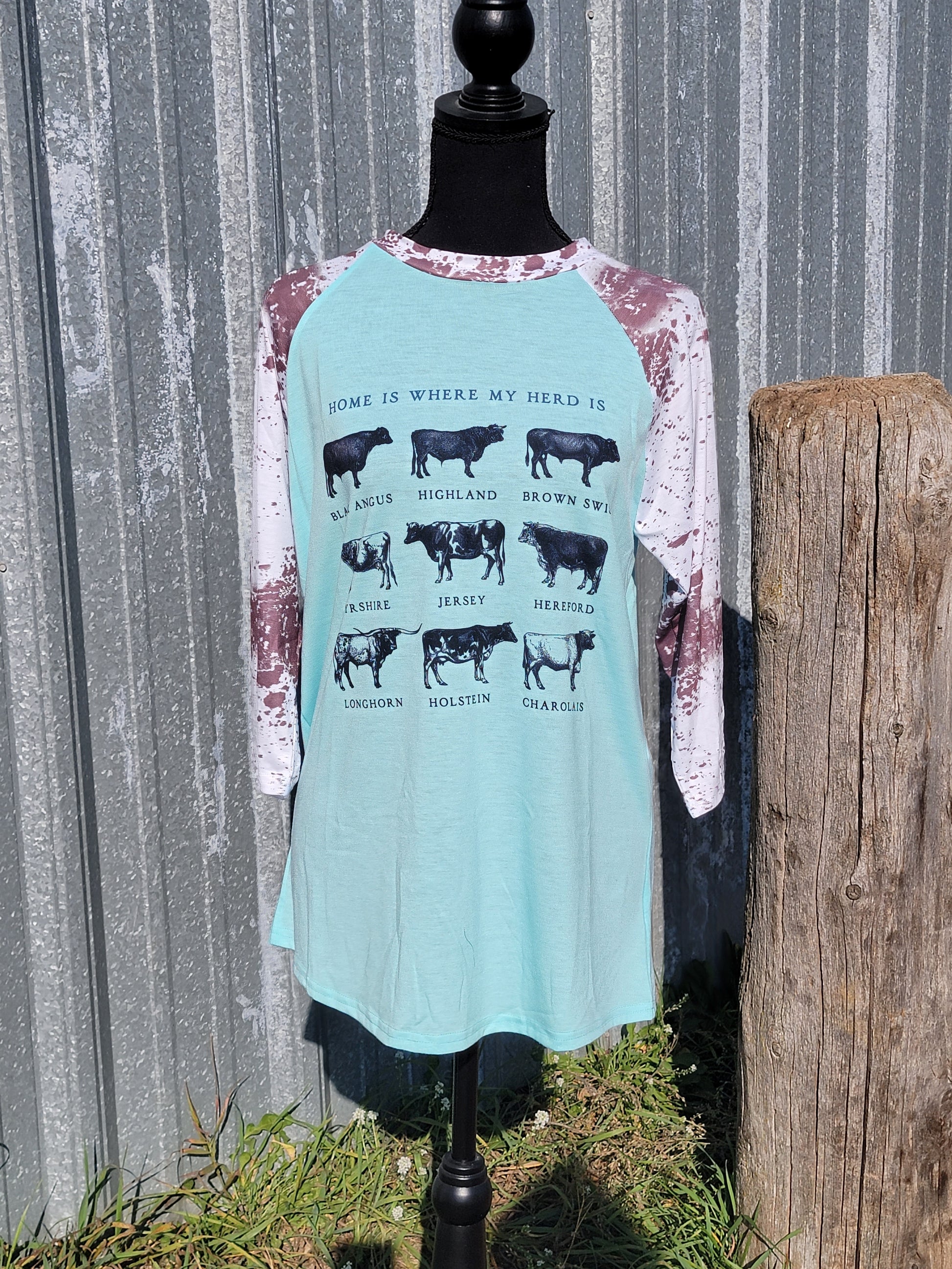 Super stretchy 3/4 sleeve baseball type shirt. Sleeves are chocolate colored cow print.