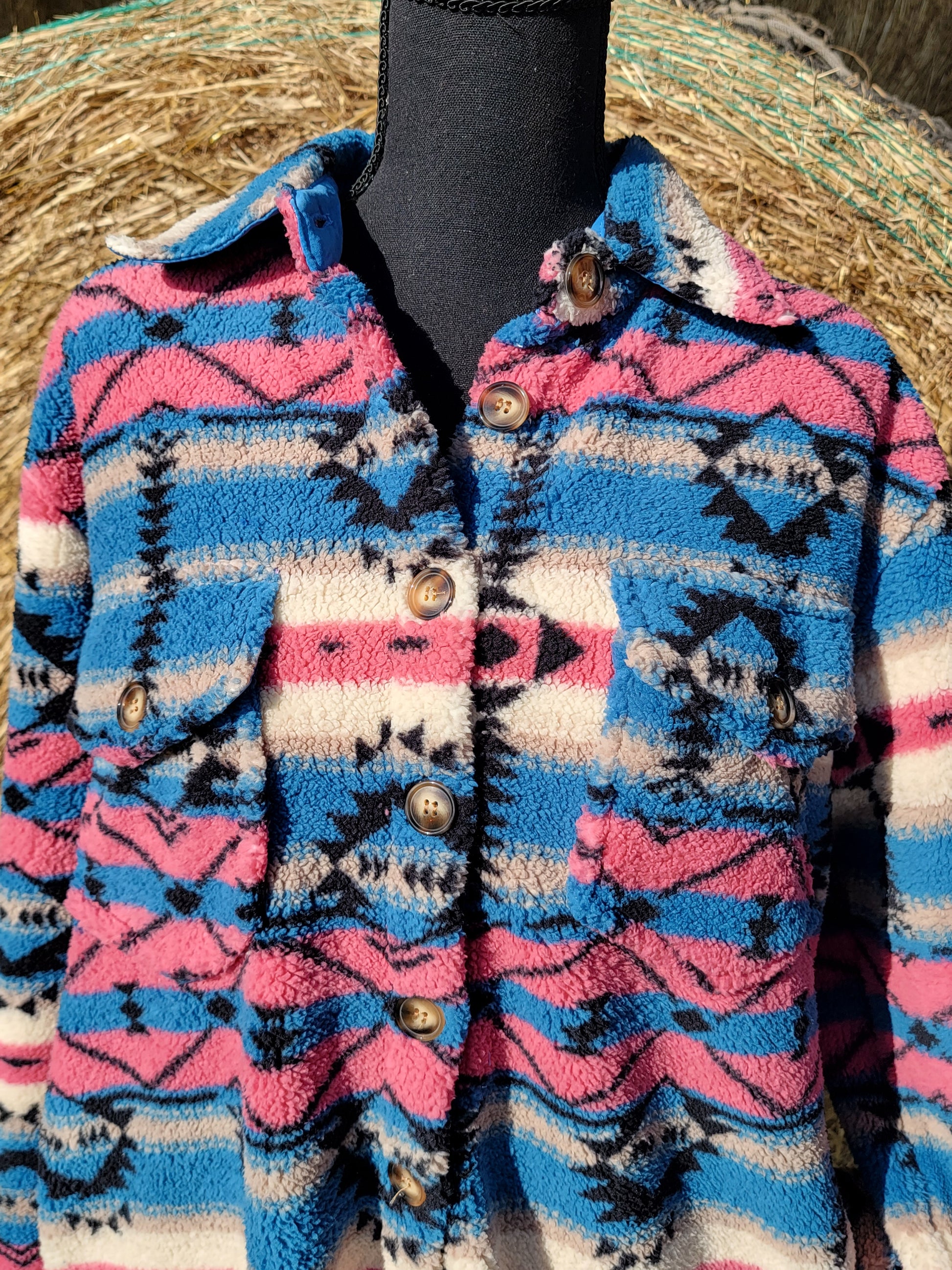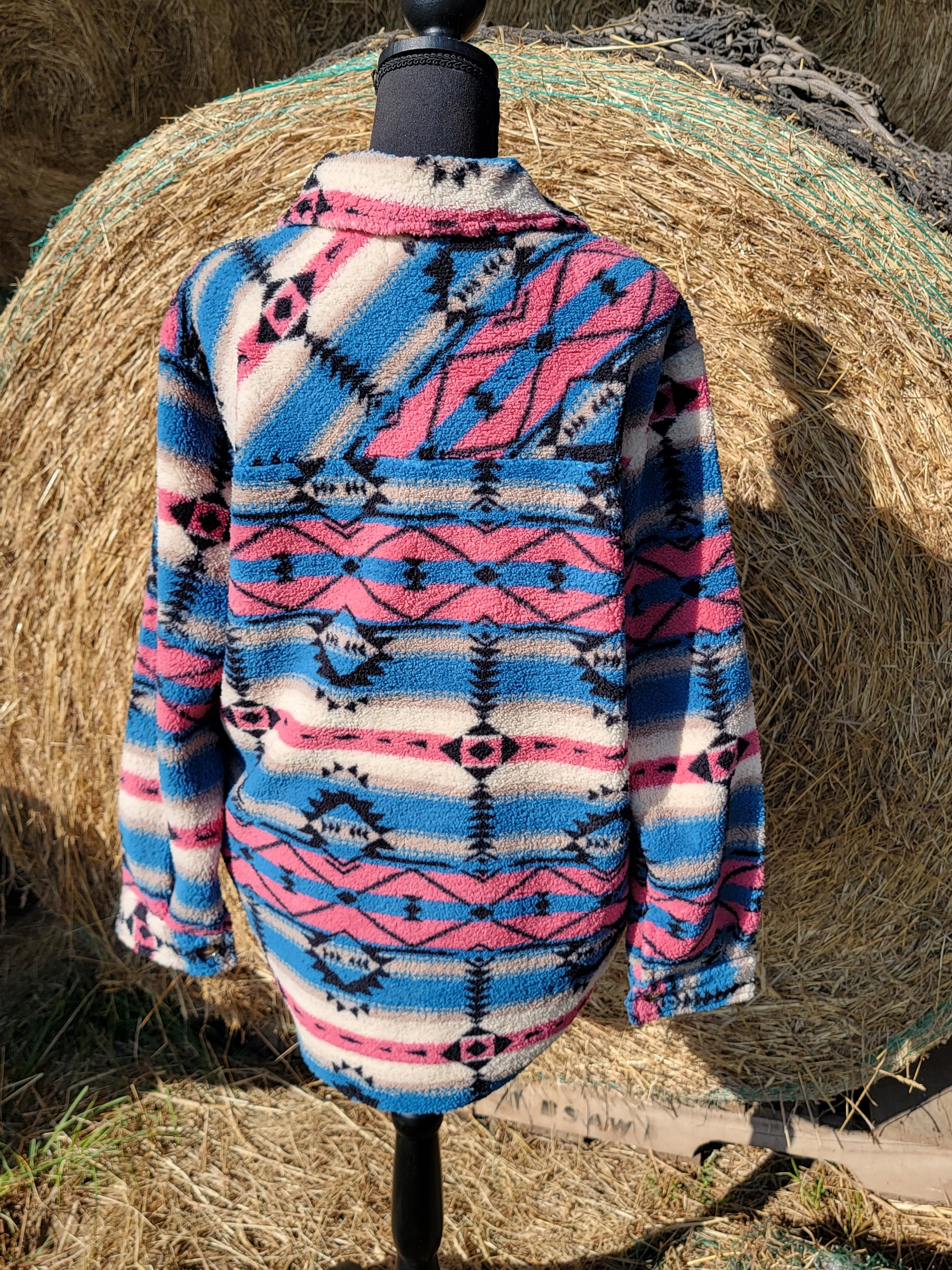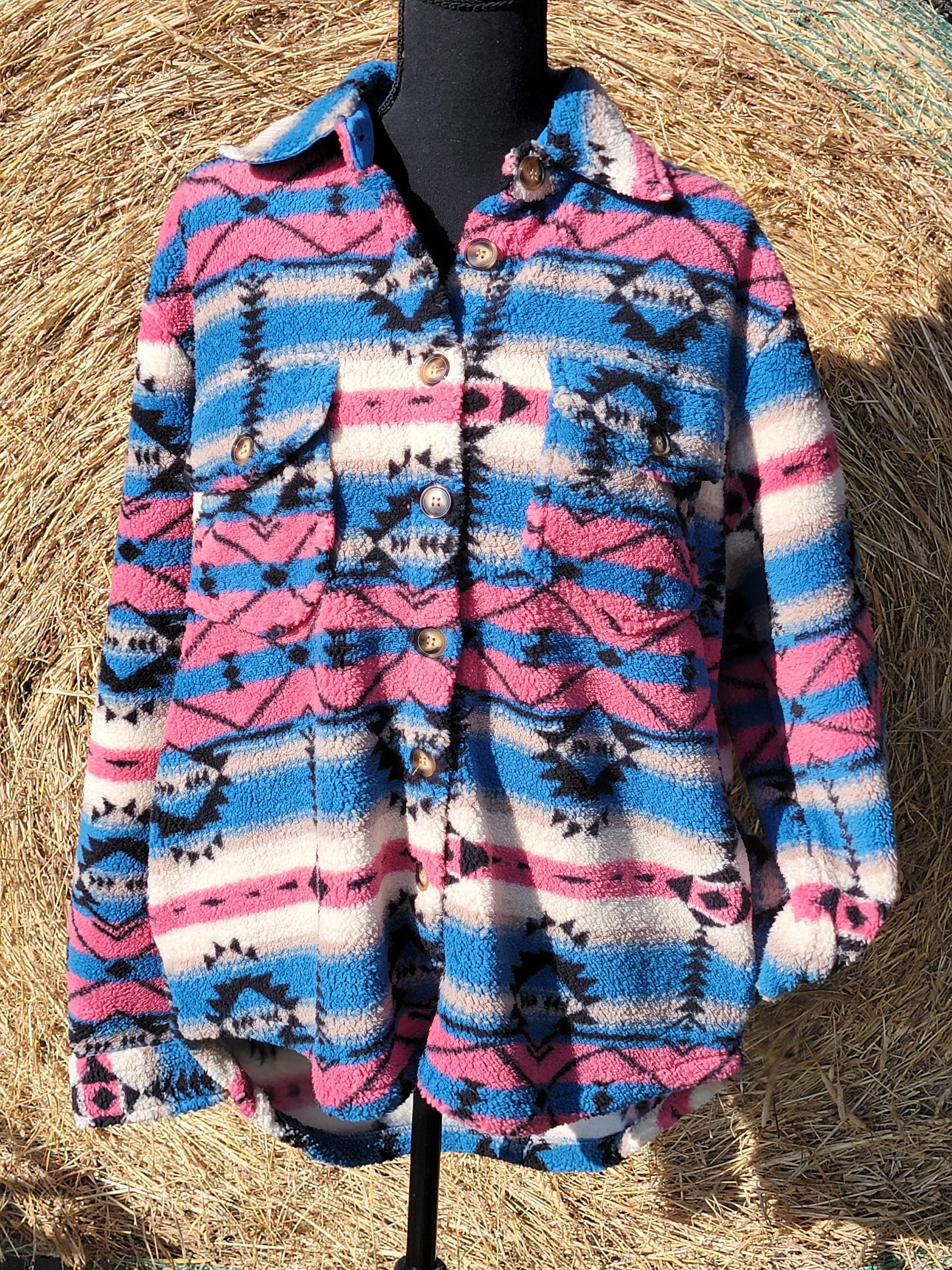 Heavy duty sherpa jacket. Printed in a pink and blue aztec pattern. Fits true to size. Has size and chest pockets.